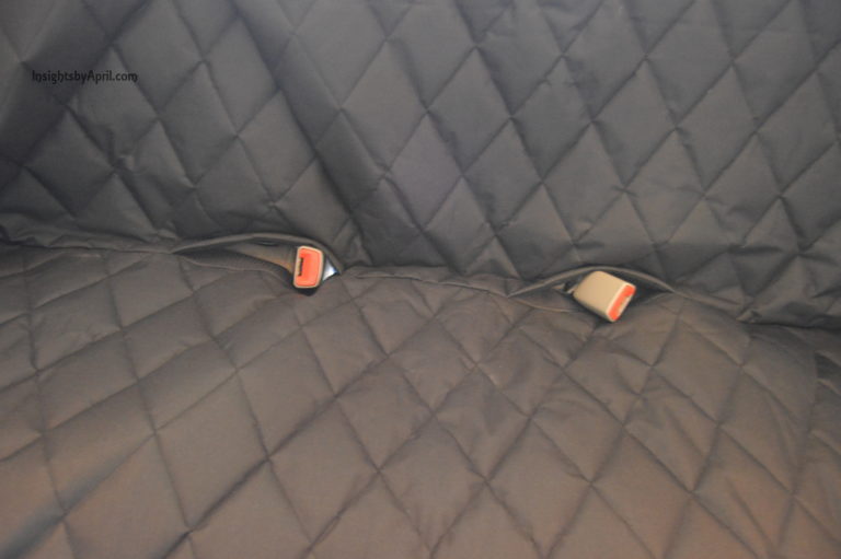 I just have to start with the fact that it is so easy to install. It is rather wide so it is best for those backseats that seat three across like in my van. Since the dog likes to sit in the third row anyways then this is perfect. The headrests on our backseat don’t come up very far so I didn’t have to use the strap that would normally go around them. There are some straps where the crease of your seat are that can tuck in to make the pet seat cover fit more snuggley in the middles.