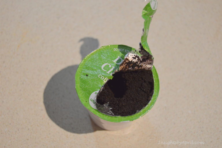 Start off by removing the foil seal at the top of the K-cup. It is really easy. Then you can either just dump out the coffee grounds or you can save them for compost or sprinkle throughout your garden.