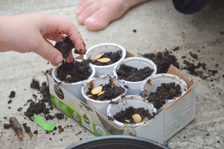 We took everything outside and I let the kids fill the K-cups with about 3/4 full with dirt. They placed 2-3 seeds inside then covered full with dirt to the top.