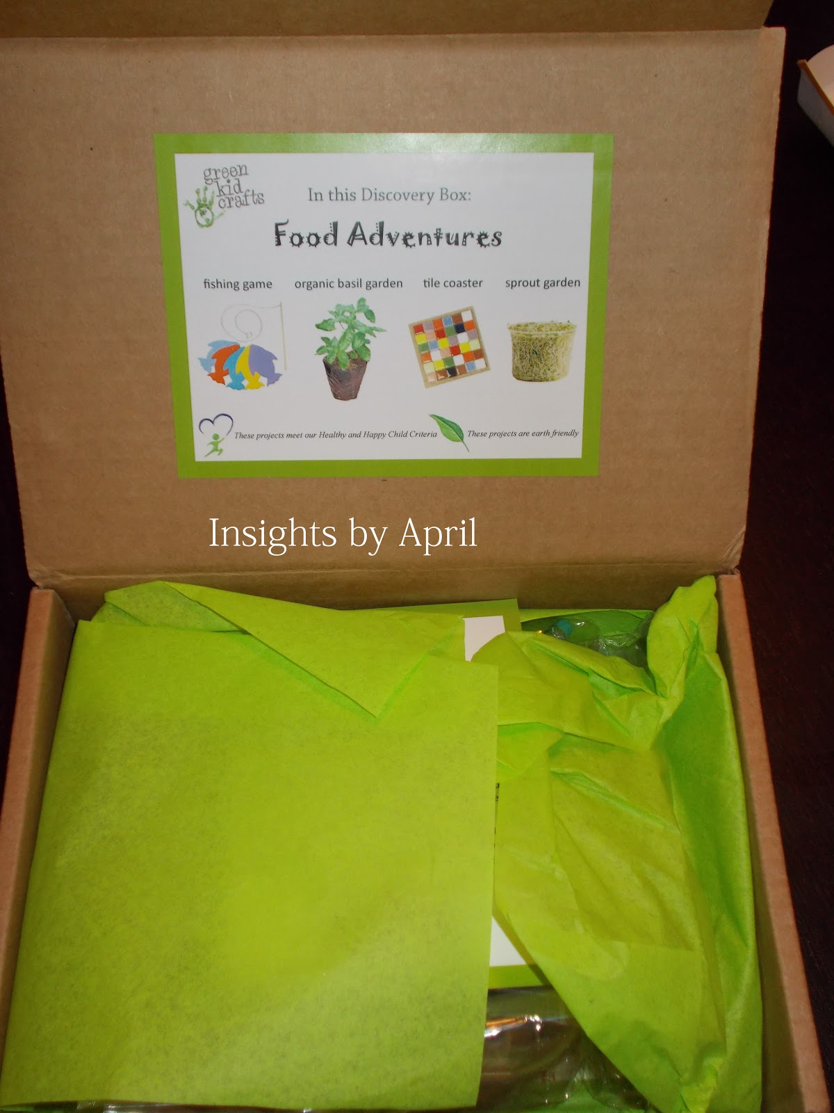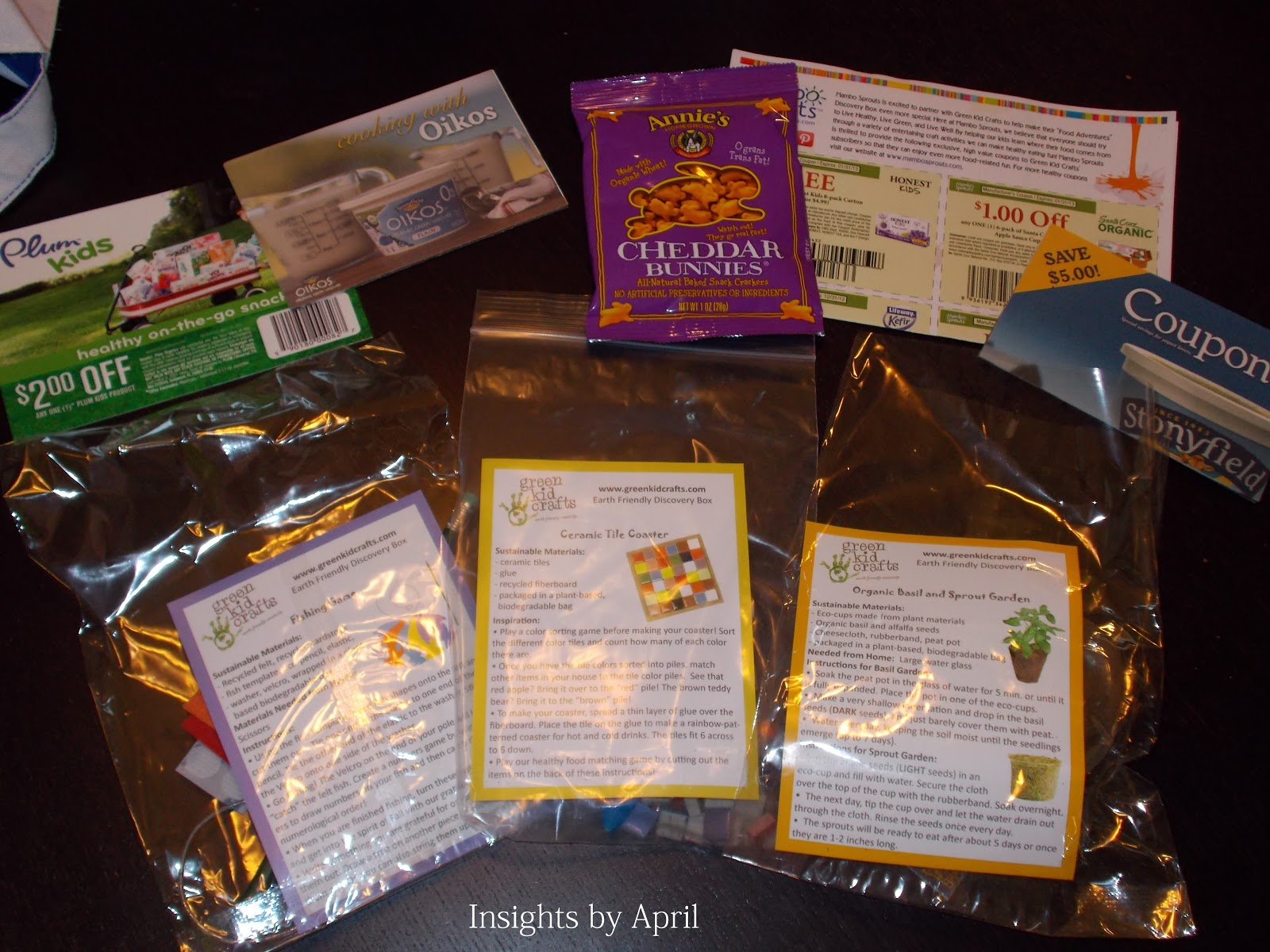 For November’s Discovery Box, Green Kid Crafts partnered with Purple Asparagus, a nonprofit educating children, families and the community about eating that’s good for the body and the planet, to create a “Food Adventures” themed box with crafts celebrating healthy eating. Craft projects include making a fish game (from recycled felt), growing organic basil and alfalfa sprout gardens, and making a set of rainbow tile coasters (image attached). In addition, Green Kid Crafts has partnered with Mambo Sprouts and some of our favorite natural food companies like Annie’s, Stonyfield, Mary’s Gone Crackers and Immaculate Baking to include samples and exclusive coupons for free healthy snacks — a $20+ value!