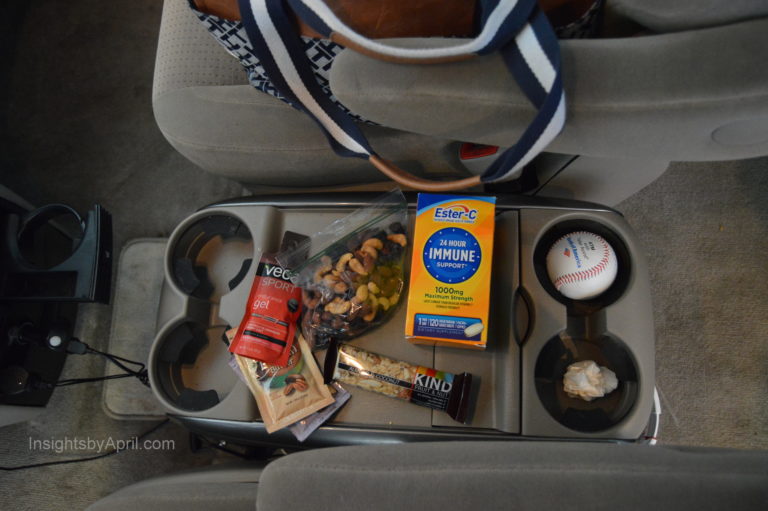 With little miss still at a different school than her brother with two different drop off and pick up times, I am in the car a lot. Plus we just started back to soccer for both kids so we have two practice times with two games on Saturday. For the next three months, we will be spending lots of time in my van going from one place to the next. I also have at least two races scheduled each month for the next few months. So I thought I would share with you what all I keep in my van to keep me going. These are things that have become staples to help me and my family be able to accomplish all we need to, be our healthy best, and not worry that we forgot something at home.