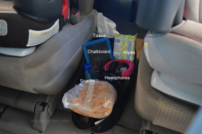The middle of the van is the kid zone. This zone has their car seats, portable DVD player for entertainment, and their own command station with wipes, tissues, snacks, and small toys. Keeping a couple of the mini water bottles is a great idea too because kids always seem to be hungry or thirsty at the wrong time. I replenish this area whenever I see their snacks getting low or a game broken so that they don’t get bored or hungry while we drive all over creation š