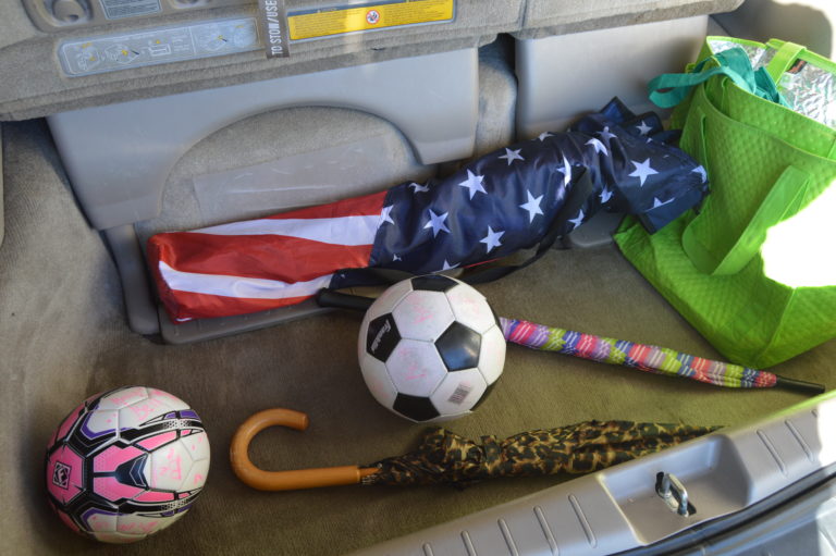 Starting at the back of the van, I have the kids soccer balls and portable chairs for the games and practices. They will stay there for the next 3 months. I also have reusable shopping bags for grocery shopping as well as if we ever have dirty shoes or clothes. During the colder soccer months I will keep a blanket and a towel in the back since the soccer fields are always windy and a lot of the times wet!!
